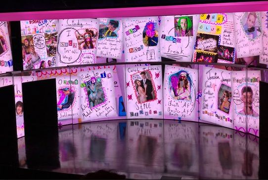 因为是网络时代背景,整体舞台设计还融入了现代通讯科技,尤其是在学校春季狂欢舞台秀Spring Fling,Regina的意外出丑引起了社交平台的轰动,这个时候舞台上方出现一个个社交账户网页,观众们可以看到视频被疯狂转发,点赞率急速攀升,大家纷纷在视频下方发表评论,现代科技在舞台上得到了淋漓尽致的呈现。
