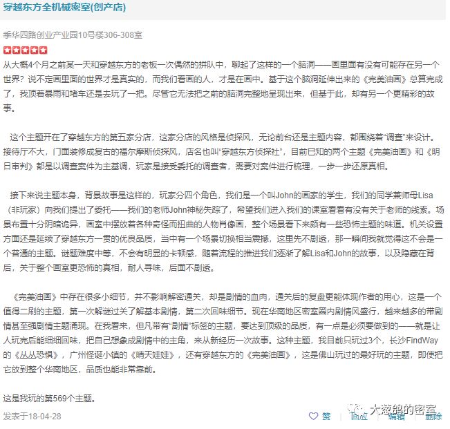 《完美油画》是当时华南地区这边少见的“深度剧情密室”,这种把一个非常厚实的故事塞进一个密室主题里面的理念,在一年前可谓非常超前。不过这种主题也有个致命的缺憾——沉长的复盘过程。对于经验老到的老油条玩家,玩深度剧情密室自然是会有非凡的体验。但是对于入门级的玩家,或者是初次接触密室的人,“解题通关”就已经足以让他们拼尽全力,在此基础上去理解一个复杂的故事,就太强人所难了。